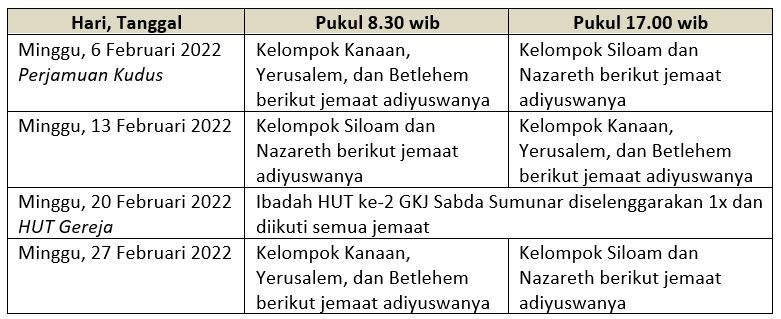 Ibadah hari Minggu di bulan Februari akan dilaksanakan dua kali yaitu pukul 8.30 wib dan pukul 17.00 wib dengan pembagian kelompok dalam setiap ibadah. Sedangkan jadwal Ibadah di gereja selama bulan Februari 2022 adalah:
