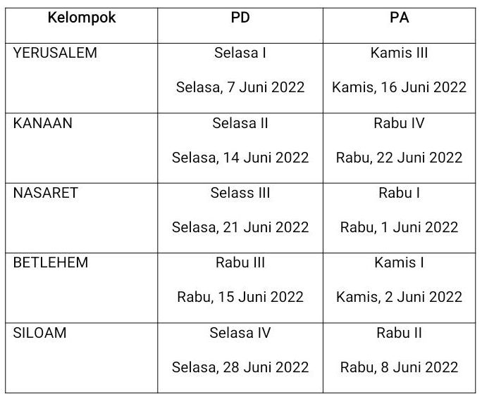 Kegiatan Persekutuan Doa dan Pemahaman Alkitab akan kembali diselenggarakan di masing-masing kelompok mulai bulan Juni 2022. Kegiatan dapat diselenggarakan di gereja atau di rumah warga yang tempatnya memungkinkan untuk diigunakan. Sedangkan untuk bulan Juni 2022 jadwal pelaksanaan Persekutuan Doa dan Pemahaman Alkitab masih tetap akan diselenggarakan di Gereja.